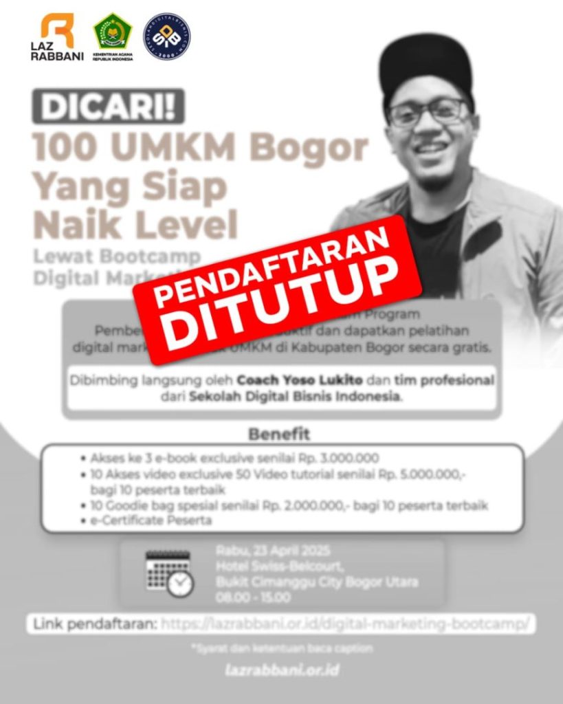 Pendaftaran Bootcamp Digital Marketing Gratis untuk 100 UMKM Bogor alhamdulillah telah terpenuhi dan untuk itu PENDAFTARAN RESMI KAMI TUTUP.